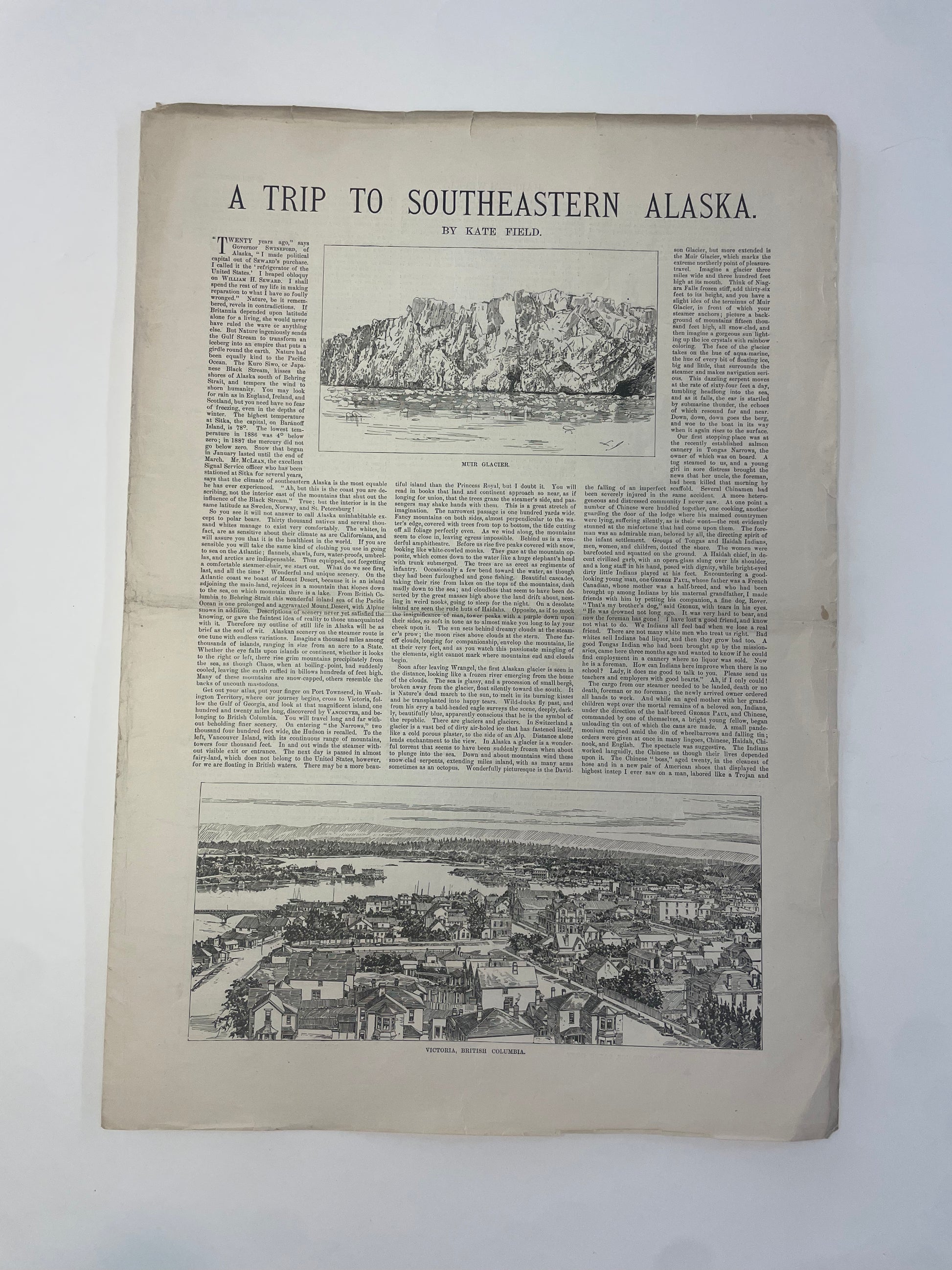 FIELD, KATE. A Trip to Southeastern Alaska. [Supplement to Harper's Weekly]. [New York]: Harper & Brothers, 1888. [4]pp. Two folio leaves. Illustrated. Old fold. Edges with minor chipping. Very good.