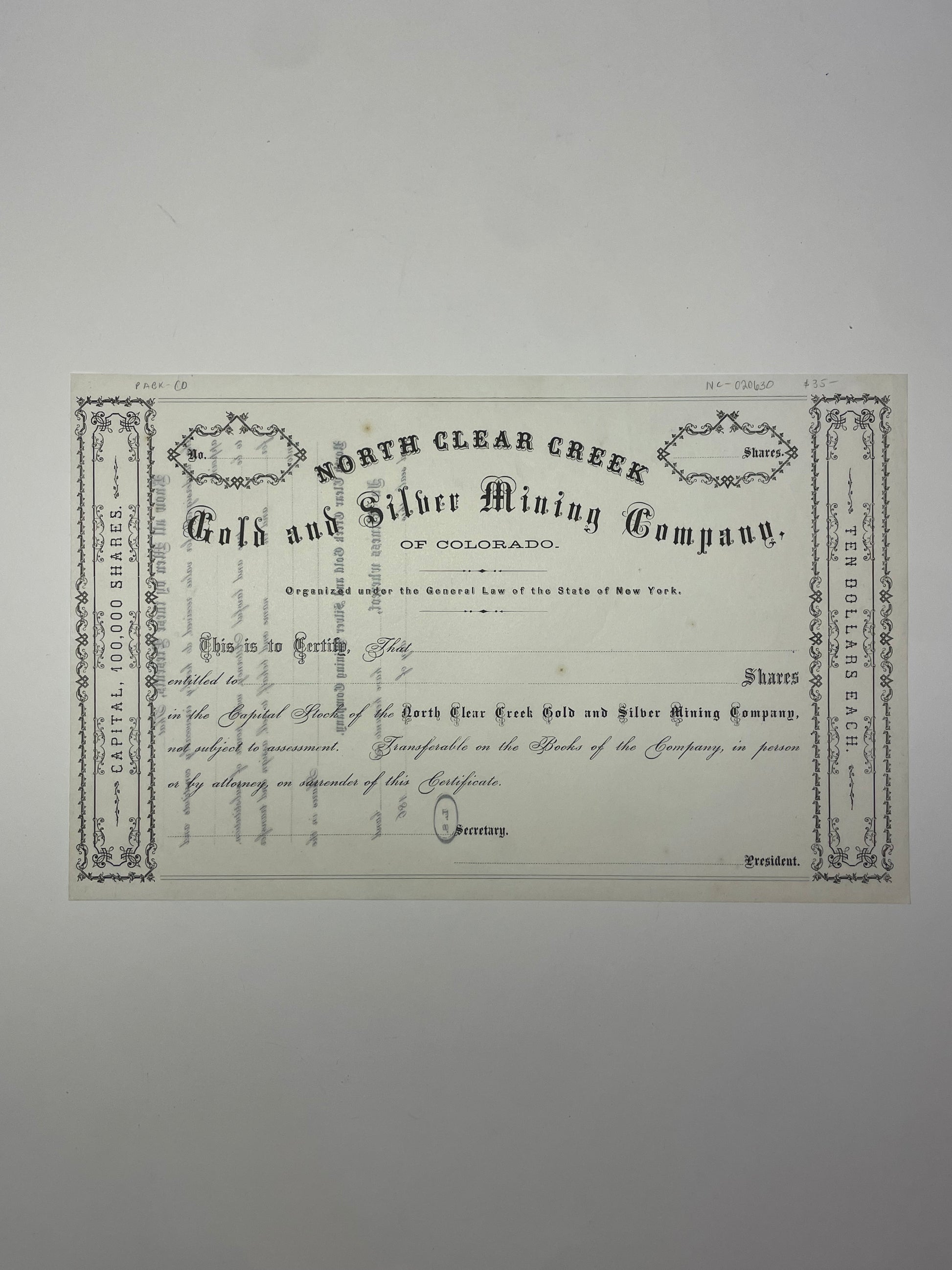Blank Stock Certificate for the North Clear Creek Gold and Silver Mining Co.