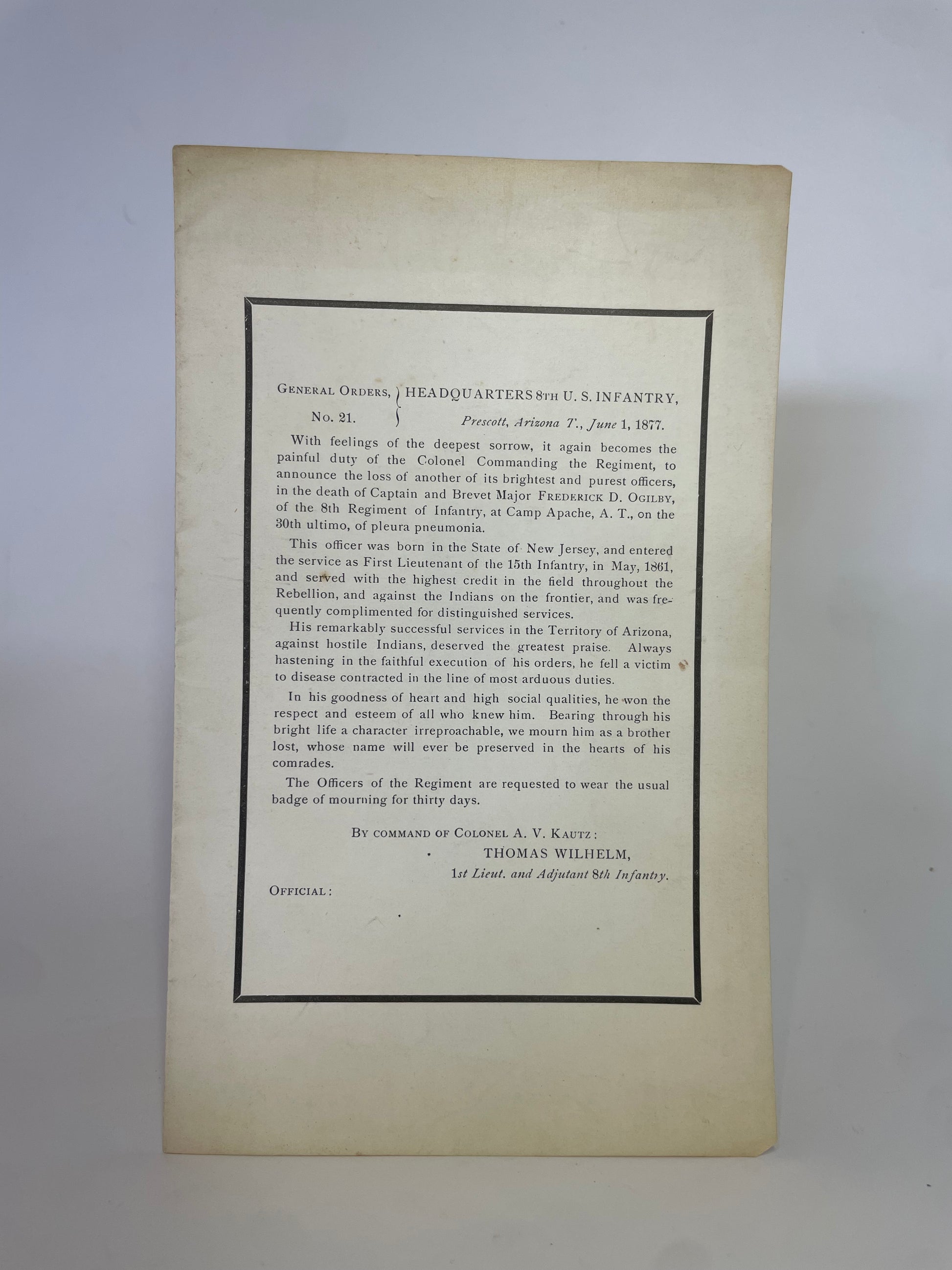 WILHELM, THOMAS. General Orders, No.21... With feelings of the deepest sorrow, it again becomes the painful duty of the Colonel Commanding the Regiment, to announce the loss of another of its brightest and purest officers... Prescott, Arizona Territory: June 1, 1877. [4]pp. Single sheet folded to form two leaves. Contents contained to first page. Very good.