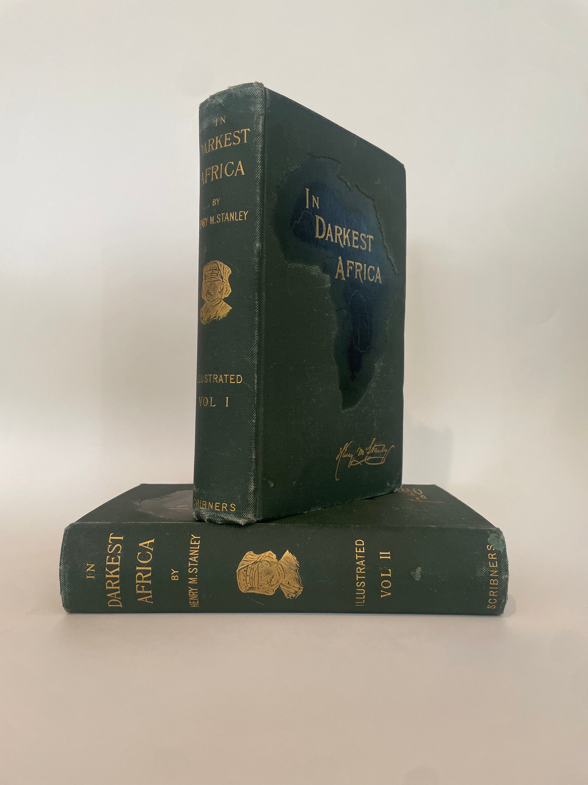 STANLEY, HENRY M., In Darkest Africa: or the Quest, Rescue and Retreat of Emin Governor of Equatoria by Henry M. Stanley with Two Steel Engravings, and One Hundred and Fifty Illustrations and Maps. In Two Volumes. New York: Charles Scribner's Sons, 1890. 2 volumes. Illustrated. Original green cloth boards with gilt. Spine gilt. Bumping to corners. Wear to edges of boards and spine. Hinges cracked. Title page of Vo.I is detached from binding. Good or better.