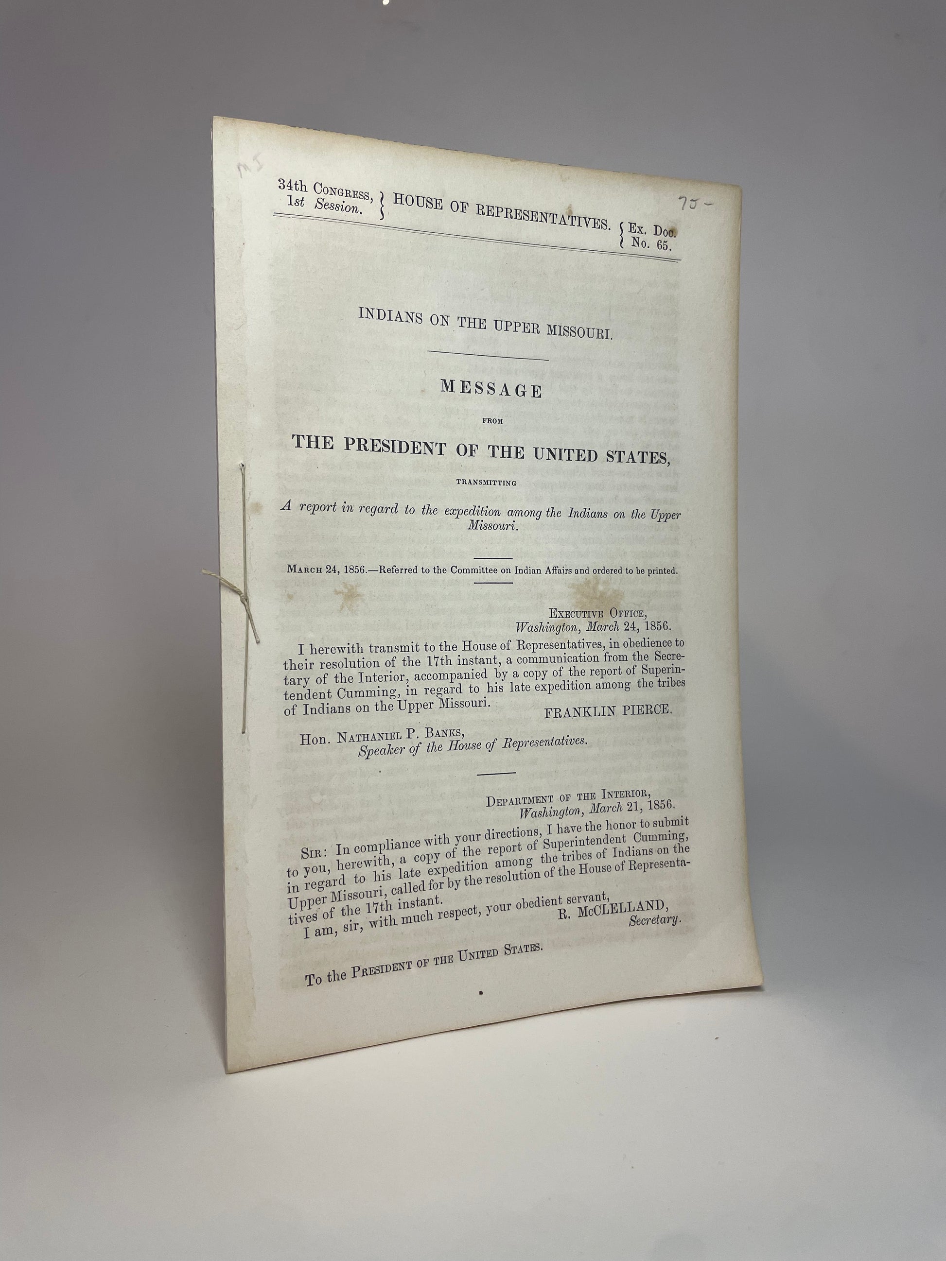 CUMMING, ALFRED. Indians on the Upper Missouri: Message from the President of the United States, Transmitting a Report in Regard to the Expedition Among the Indians on the Upper Missouri. [Washington?]: 1856. 15pp. Original printed stitched self-wrappers. Very good or better.