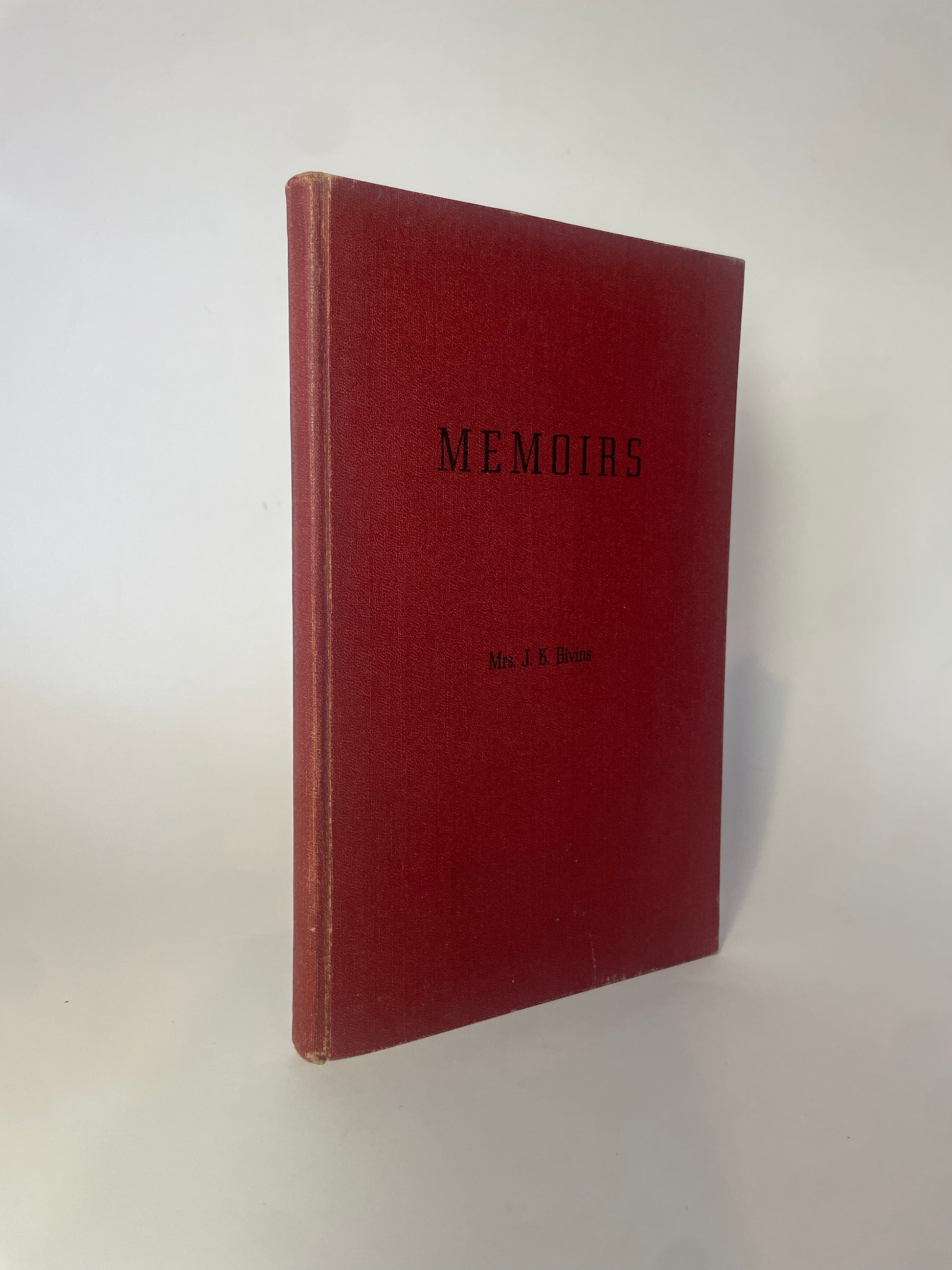 BIVINS, Mrs. J.K., Memoirs. [No publication information]. 138pp. Frontis. Illustrated. Original red cloth boards with title on front board. Inscribed by author. Very good or better.