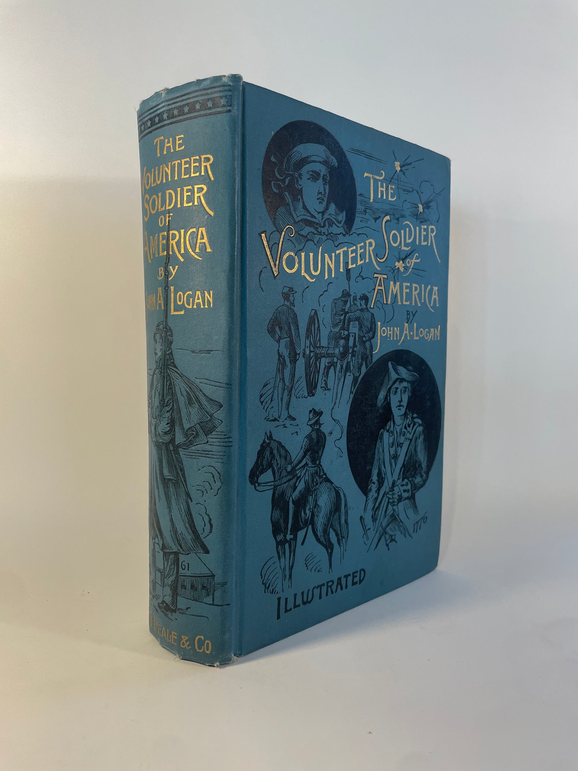 LOGAN, JOHN A., The Volunteer Soldier of America. Chicago & New York: R.S. Peale & Co., 1887. 706p. Illustrated. Colorful frontis illustration. Original decorative blue cloth boards with gilt. Spine gilt and with illustration. Minor rubbing. Hinges starting. Very good.